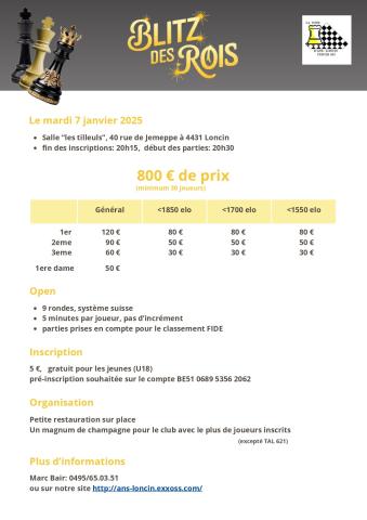 Le 7 janvier 2025, la T.A.L organise le tournoi "Blitz des Rois".Il s'agit de parties rapides en 5 minutes par joueur, soit 10 minutes maximum pour une partie.Rendez-vous à la Salle "Les Tilleuls" , 40 Rue de Jemeppe à 4431 Loncin. Date de début 07/01/2025 Date de fin 07/01/2025 Lieu Salle des Tilleuls